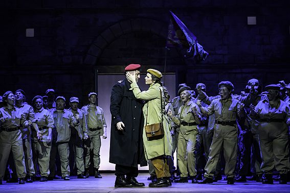 Otello: Szene mit Otello und Desdemona, Soldaten (Ensemble) im Hintergrund