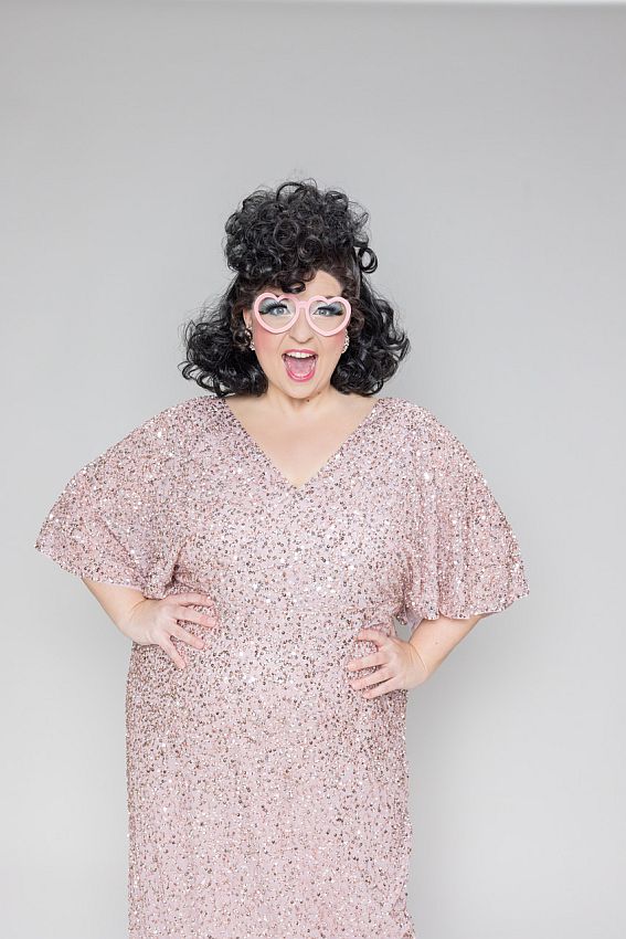 Stephanie Lamm. Beschreibung: Die Darstellerin im rosafarbenen Paillettenkleid.